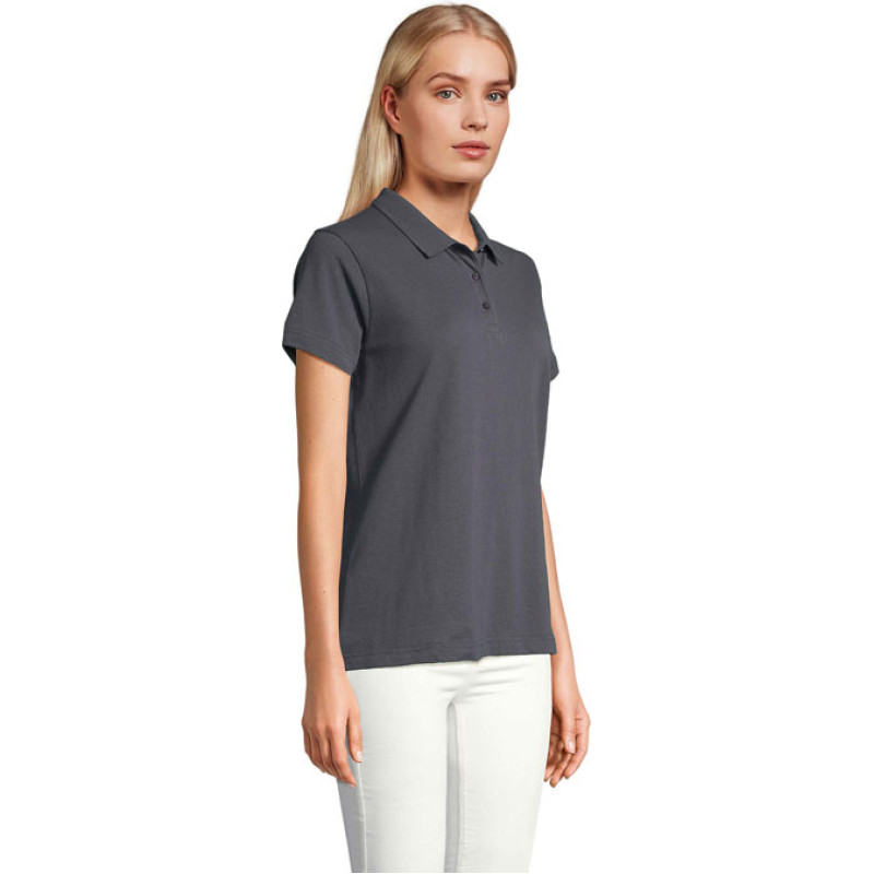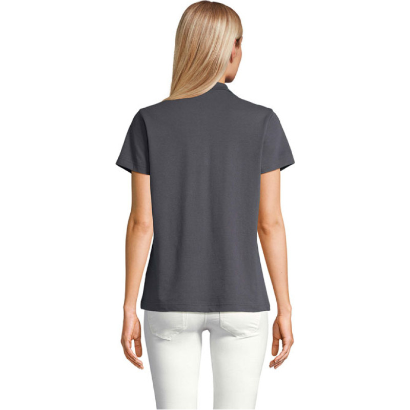 SOL'S PULSE WOMEN POLO, women's polo shirt, 100% ring-spun combed cotton, new fit, ribbed collar, neck tape, reinforced button placket, short sleeves, tone-on-tone 3-button placket, straight hem, cut and sewn, spare button on inside side seam. For size information, please refer to the size chart in the product documentation.