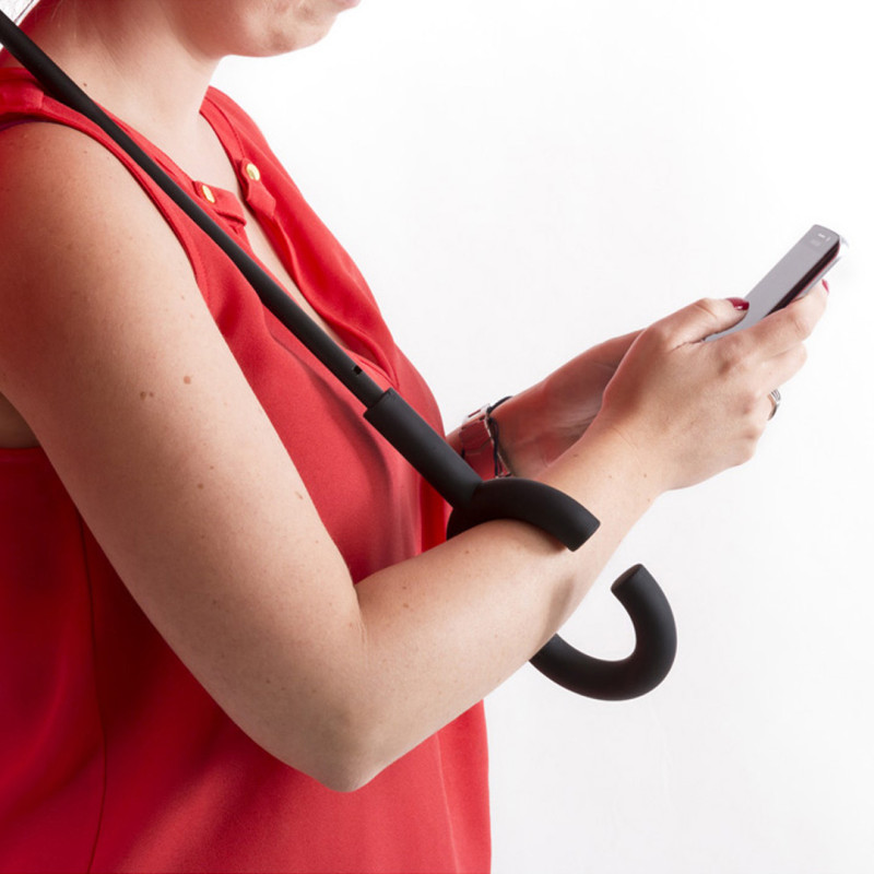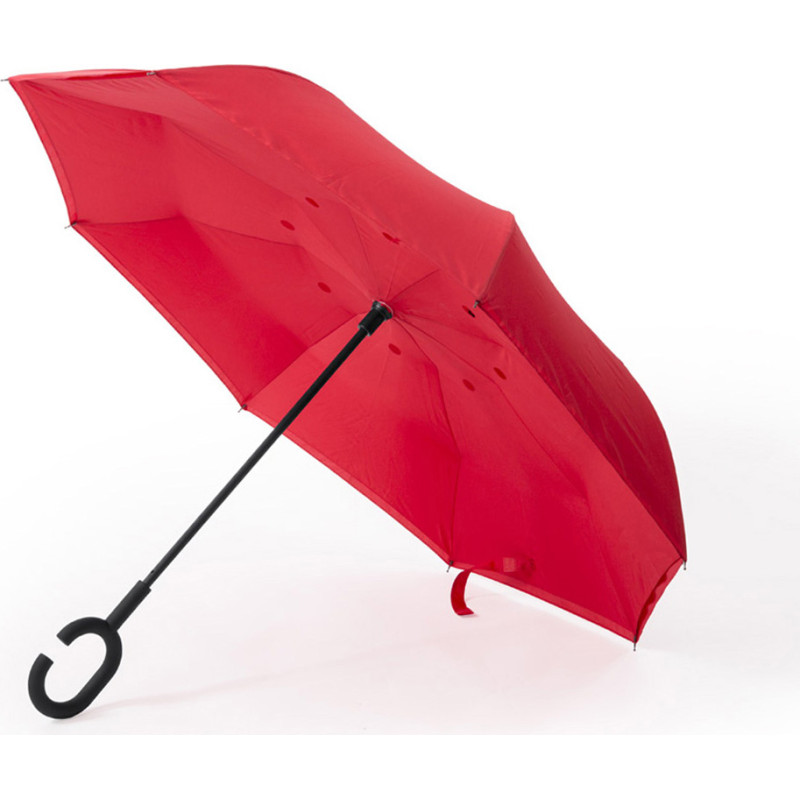 8-panel reversible umbrella, made of resistant, colorful pongee material with original hands-free handle. 108cm in diameter, with manual opening, fiber ribs and velcro closure.