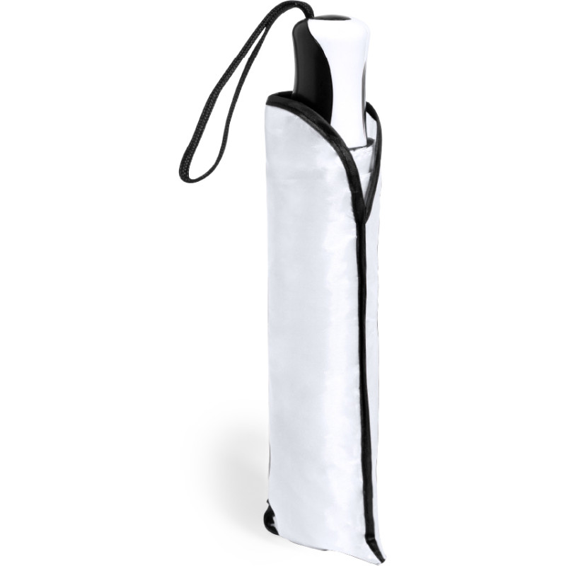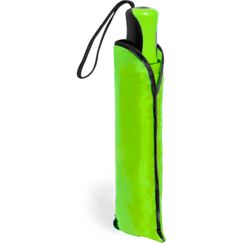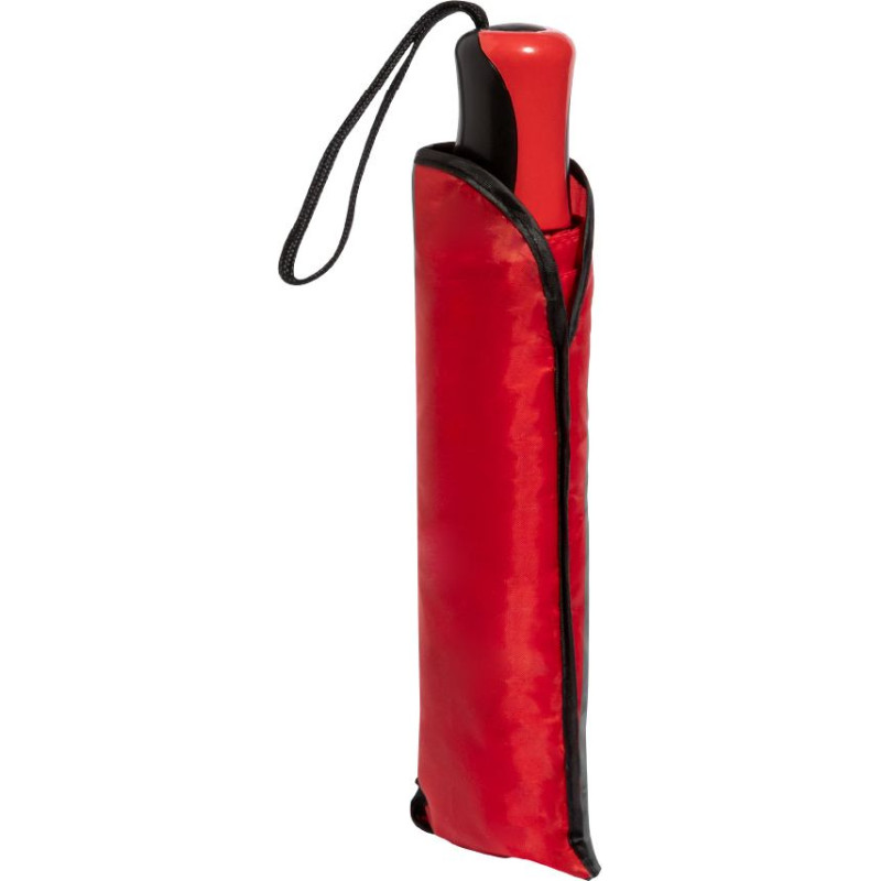 8-panel folding umbrella made in 190T polyester. Manual opening, with silver coloured metal ribs and velcro fastening. Ergonomic handle with carrying strap and matching protective sleeve. Available in a wide range of colours. Presented in an individual recycled bag.