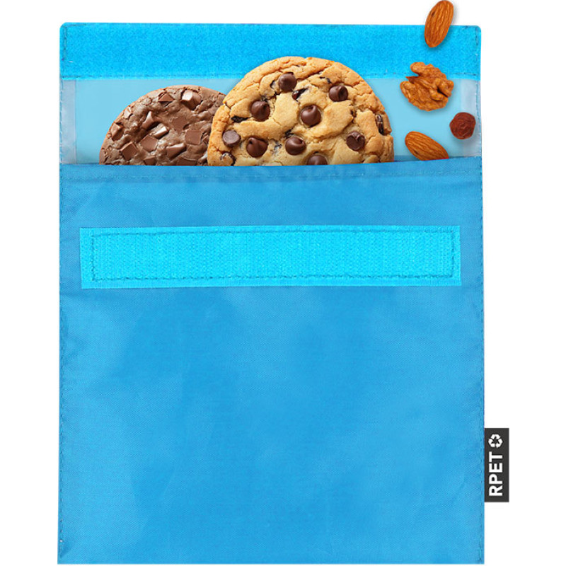 Thermal snack holder made of RPET 210T polyester. Isothermal interior in PEVA, with velcro closure and external label with RPET designation.RPET material is made from recycled plastic to promote the reuse of plastic waste and help the sustainability of the planet.
