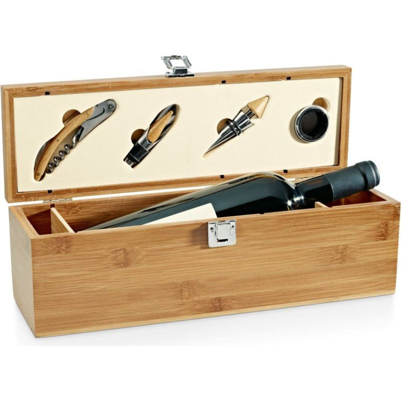 Bamboo, zinc and stainless steel wine set. This set includes: corkscrew with sommelier knife, drip stopper, pourer with lid and stopper. As the product is made from natural materials, the colour and the printing result may vary between products. 363 x 112 x 119 mm