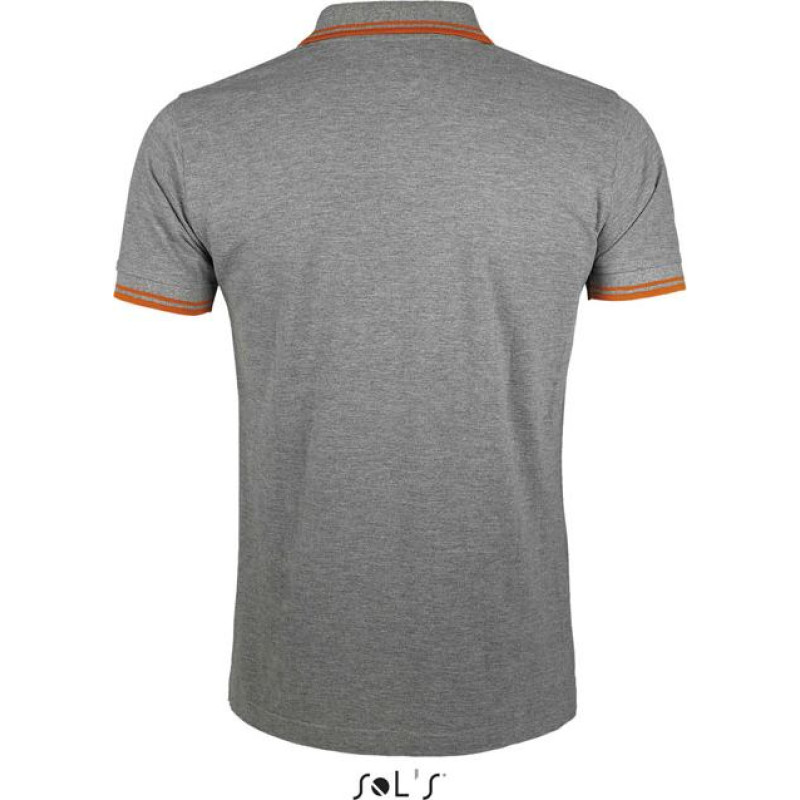SOL'S PASADENA MEN,Men's Polo Shirt, 100% Ringspun cotton PIQUÉ 200, Rib 1x1 collar and cuffs, Reinforcing tape on neck, Short sleeves, Contrasting stripes on collar and cuffs, Tone on tone 3 button placket, Fitted cut, Cut and sewn, Side slits, Spare button on the inside seam, (1) Grey / Navy : 85 % cotton / 15 % viscose, (2) Grey melange / Orange : 85 % cotton / 15 % viscose. About sizes matching, please refer to the size chart in the product documentation section.